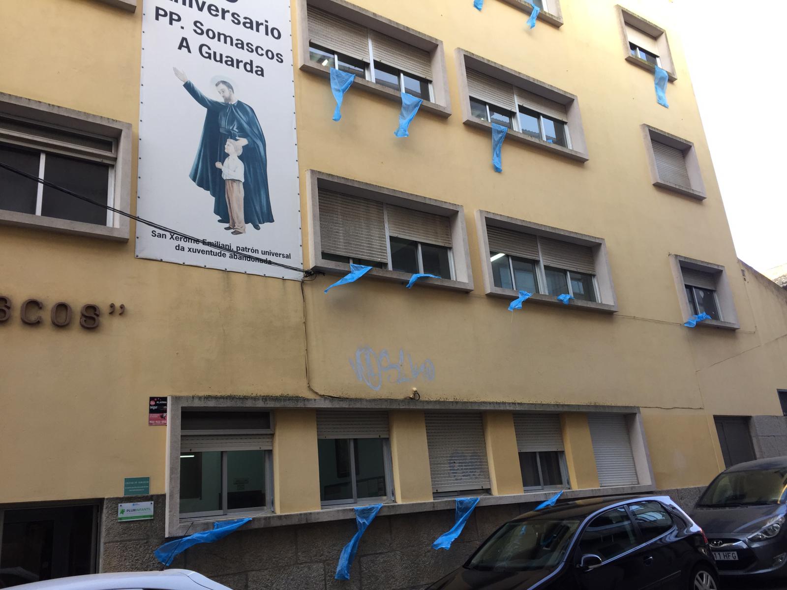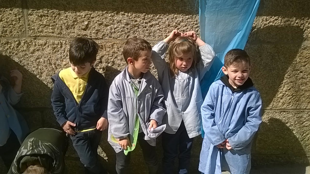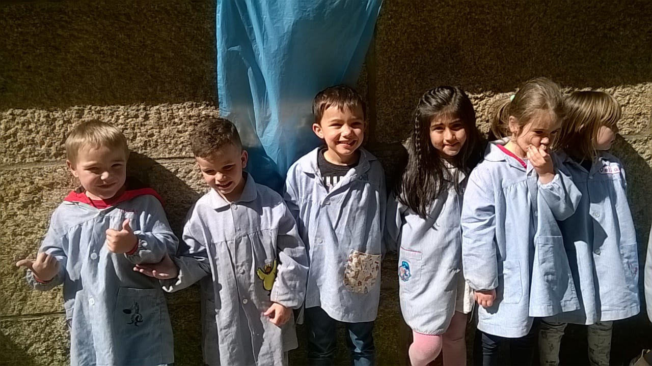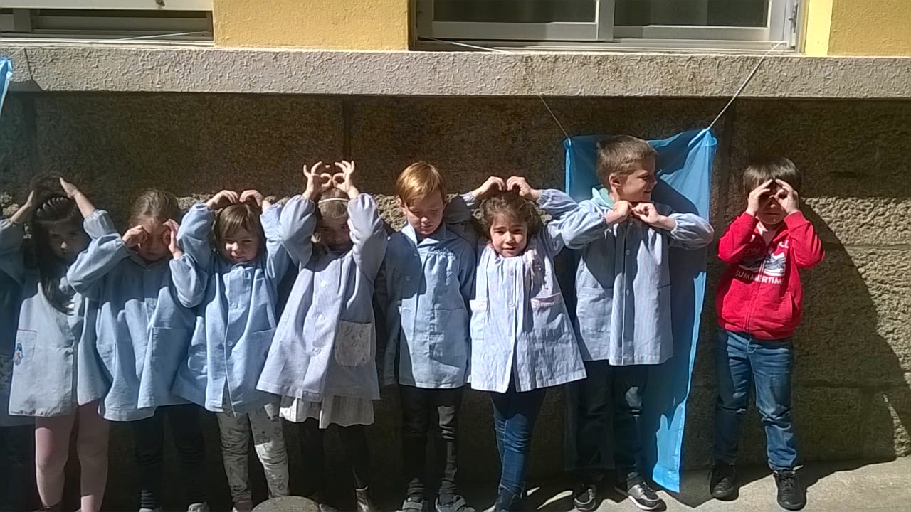Alumnos de 6 EI ante a fachada do colexio, vestidos de azul no Día de concienciación sobre o autismo. Porque cada xesto conta para vivenciar a inclusión.