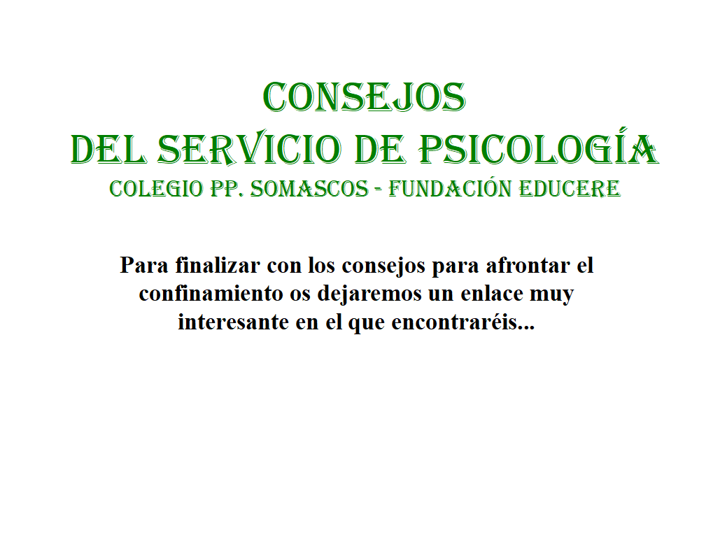 ¡Hola, Familias! os presentamos el último consejo del servicio de psicología para afrontar el confinamiento. Tenéis un recurso que os puede resultar de mucha utilidad. Un abrazo.