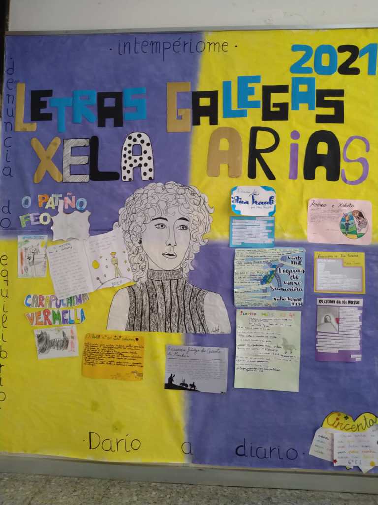 Esta semana estivemos a traballar no centro a Xela Arias, figura homenaxeada na festa do 17 de Maio deste ano. A actividade arrancou desde que o alumnado de ESO comezou a preparar un photocall que serviría de fondo para o estudo da de Sarria atendendo a súa faceta de tradutora; nel quedarían recollidos título e anacos de contos, libros de literatura infantil e xuvenil clásica – universal. Tamén celebramos o Certame de literatura e debuxo Xosé Carlos Gómez Alfaro no que foron premiados traballos cos que colaboramos na actividade do Concello “Tendal de poemas”.