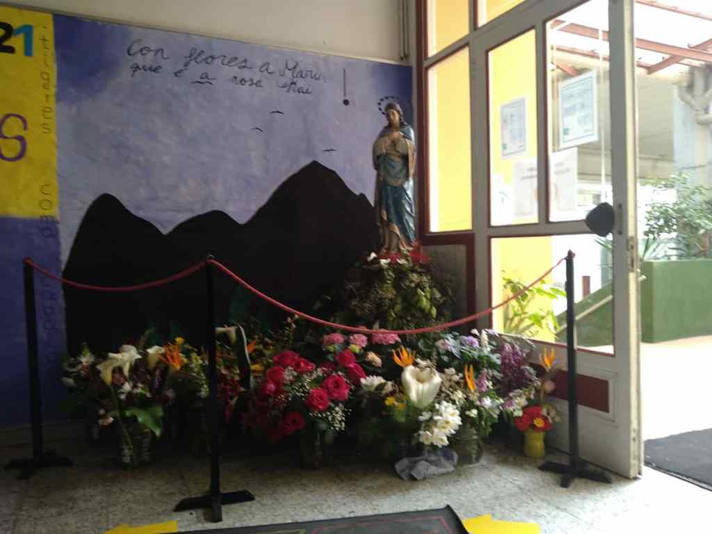 Neste mes de maio estamos a levar a cabo unha actividade en honor á Virxe. Tratábase de facer un manto floral con todo o que o alumnado fora traendo e permitira cubrir un pedestal preparado para a ocasión.