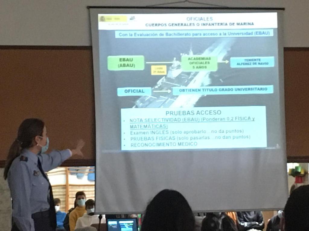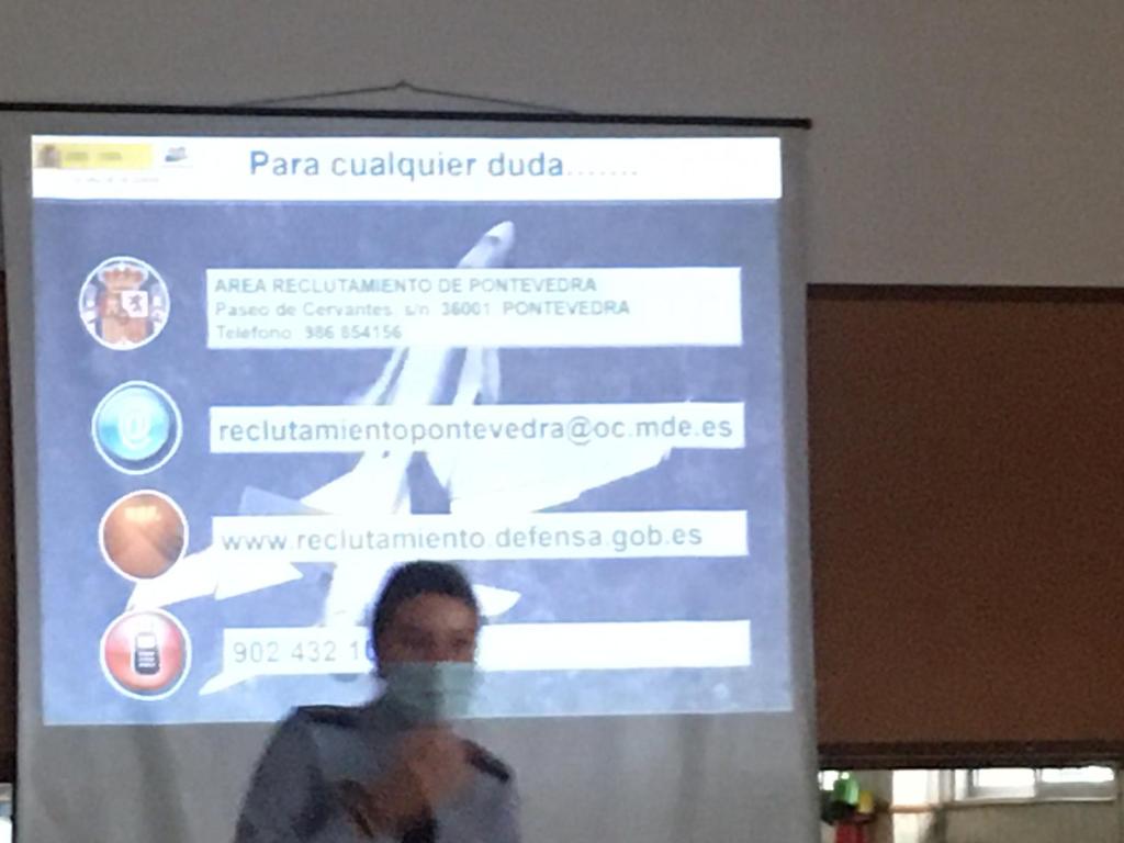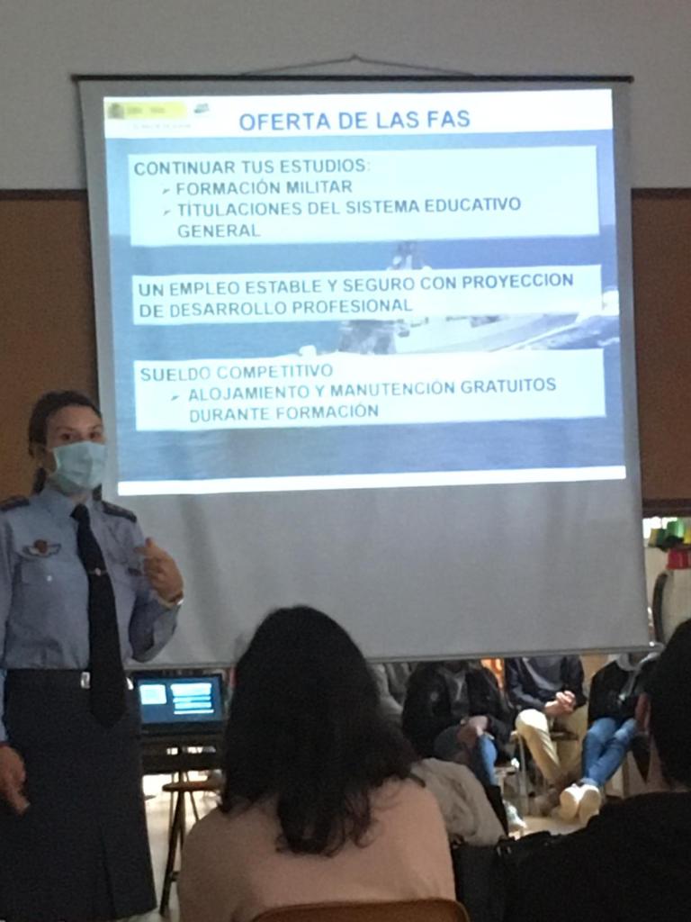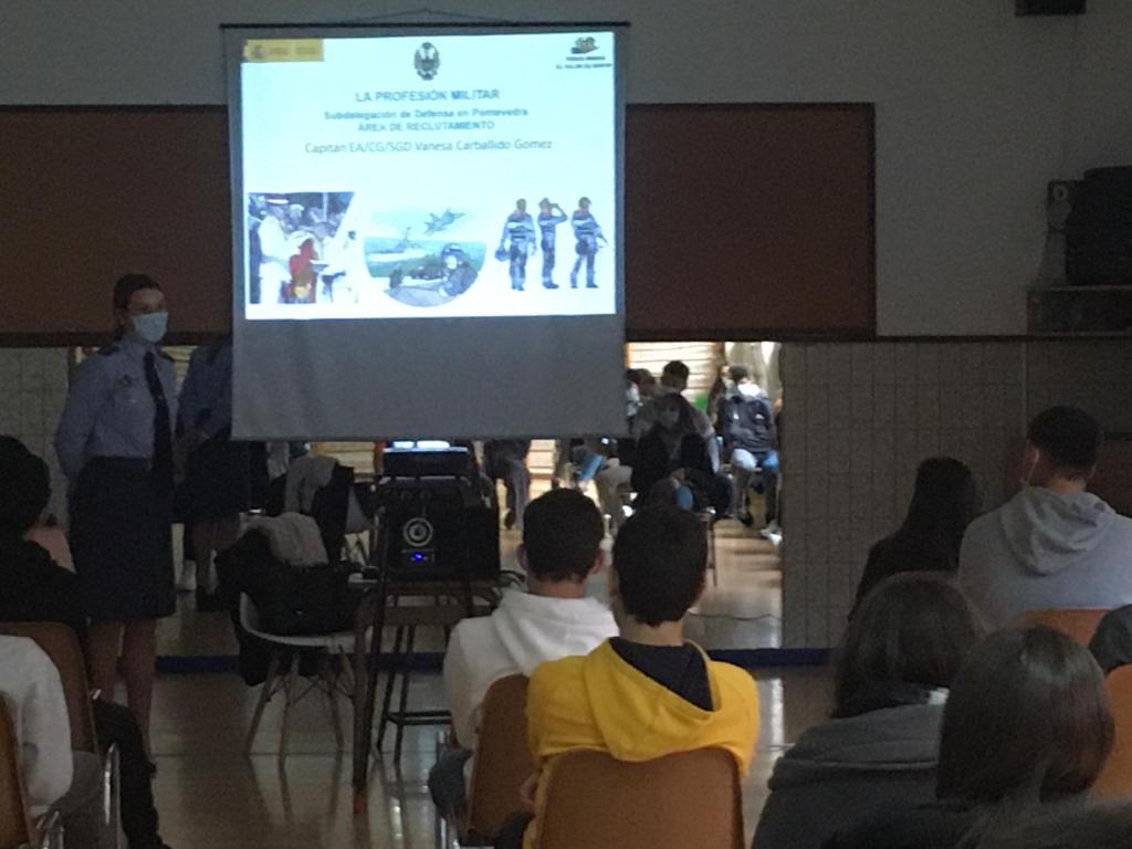 Charla sobre as Forzas Armadas para achegar a profesión militar ó alumnado de 3 e 4 ESO. Impartiuna Vanesa Carballido, capitana do exército do aire. Unha maneira comprometida de servizo ó país.