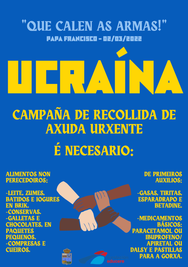 Ante a impotencia que todos estamos a sentir polo drama da guerra, o colexio súmase ás axudas urxentes de socorro. Así, pon en marcha unha campaña de recollida de produtos de necesidade inmediata para refuxiados.