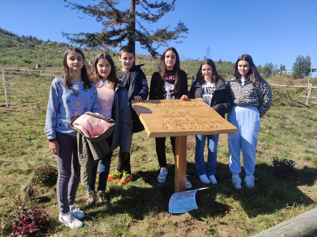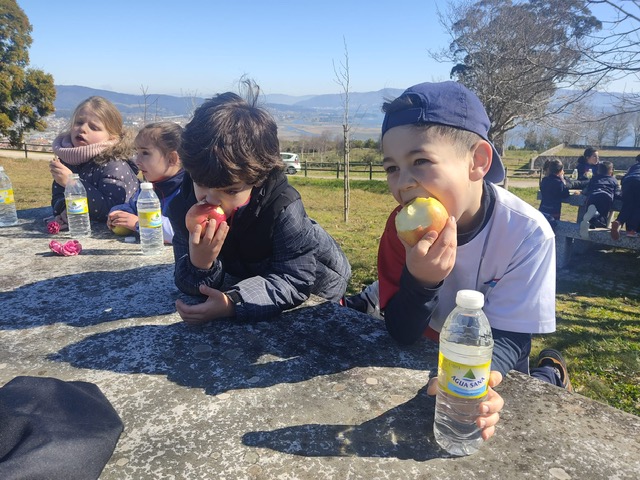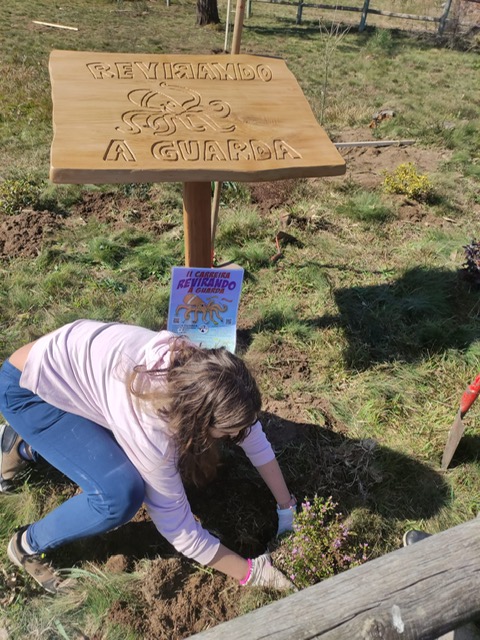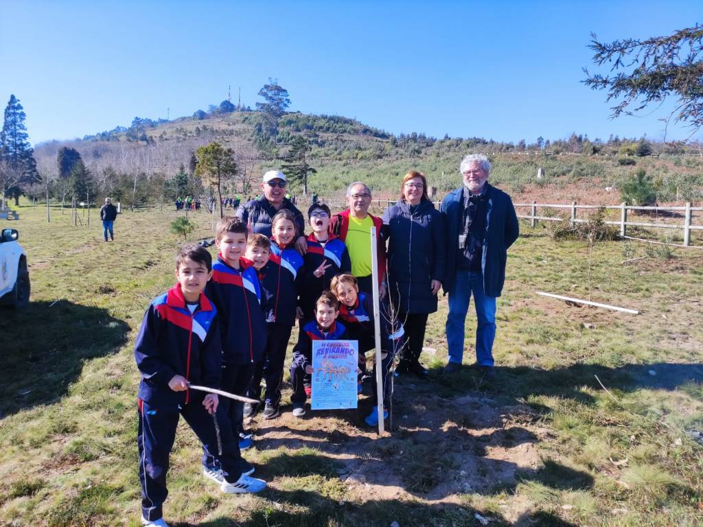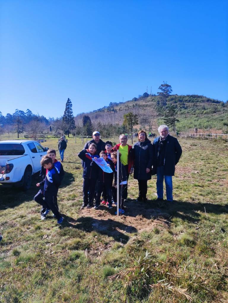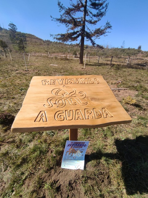 Ao final da xornada o alumnado deixou nun fermoso atril de madeira a imaxe do noso amigo o cefalópodo de Revirando, co fin de inmortalizar a visita. Agradecemos á Comunidade de Montes de Camposancos a cesión do terreo, ao Concello pola doazón das árbores e a Viveiros Río Tollo pola achega das plantas.