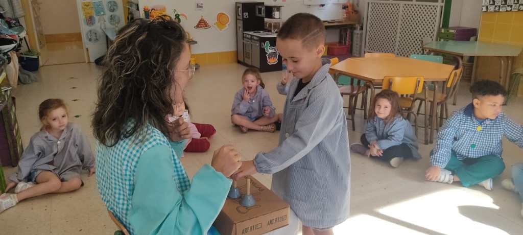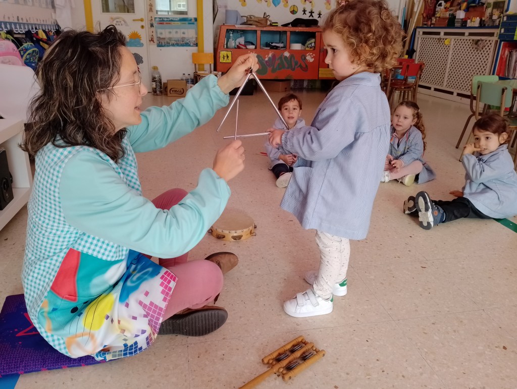 Respecto á audición, un dos exercicios favoritos do alumnado consiste en recoñecer un instrumento ou secuencia de instrumentos entre varios. Para iso empréganse campás, silbatos ou instrumentos Orff (triángulo, crótalos, pandeiretas, claves…). O alumnado experimenta o son percibindo nas súas propias mans as vibracións do instrumento (triángulo) ou a altura (frauta de émbolo). É a mellor forma de comprender a produción do son.