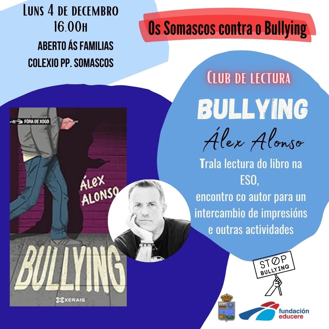 O vindeiro luns 4 de decembro, ás 16:00 horas, o Colexio PP. Somascos da Guarda – Fundación Educere organiza un encontro, aberto ás familias, co escritor Álex Alonso, autor do libro Bullying, para un intercambio de impresións e outras actividades. Este acto enmárcase na campaña que está levando a cabo o colexio PP. Somascos contra o bullying ou acoso escolar, no marco do seu Plan de Convivencia. A principal actividade desta campaña foi a lectura nos cursos da ESO do citado libro Bullying de Álex Alonso, seleccionado a tal fin polo Equipo de Dinamización Lingüística, en torno ao cal estanse a realizar traballos curriculares e probas académicas. Todo este obradoiro rematará o mencionado luns 4 de decembro nun encontro co autor ao que, reiteramos, están invitadas todas as familias que desexen ou poidan acudir.