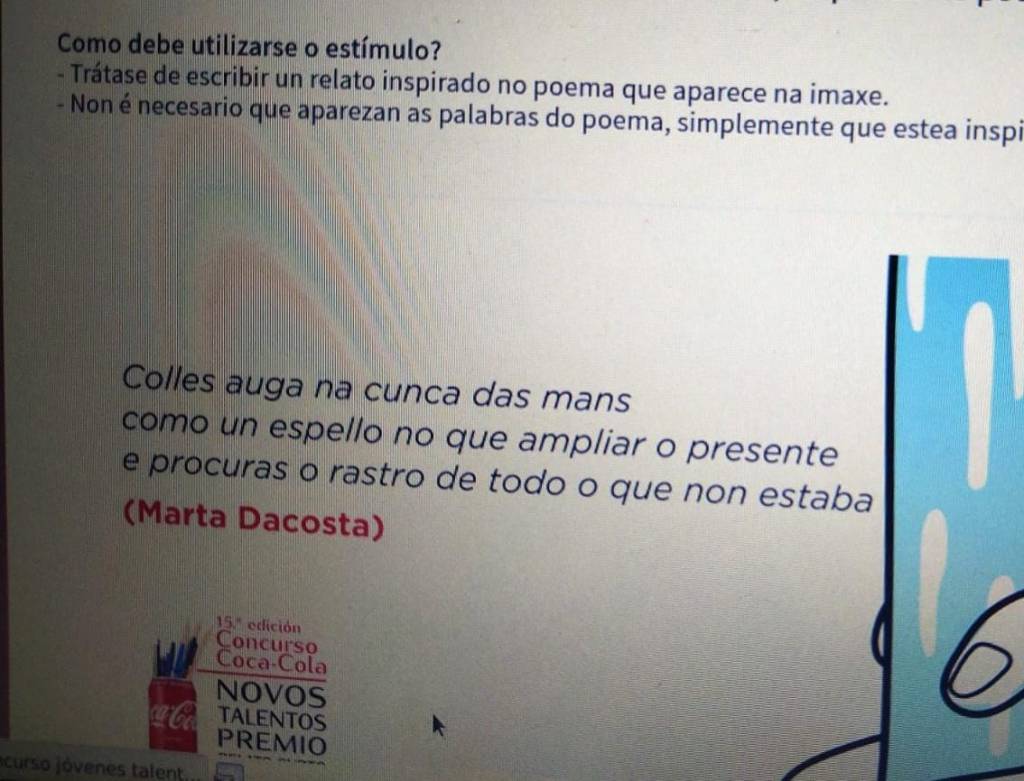 O xoves 7 e o venres 8 de marzo de 2024 catro alumnos de 2º ESO do Colexio PP. Somascos da Guarda – Fundación Educere participaron no certame de relato curto que todos os anos organiza Coca-Cola; o xoves en lingua galega e o venres en lingua castelá. Eses alumnos foron: Mario Baz Álvarez, Alberto Berridy Pérez, Inés Cividanes González e Daniela Pacheco Vega. A actividade discorreu nunha plataforma dixital na que todos os participantes escribían á vez, á hora e no tempo que tiñan estipulado. Os nosos realizaron as súas creacións na biblioteca do centro, e este ano o estímulo creativo que lles mandaron para espertar a inspiración de cara a creación do seu relato foron dous poemas: un de Marta Dacosta para o relato en galego e outro de Federico García Lorca para o de castelán.