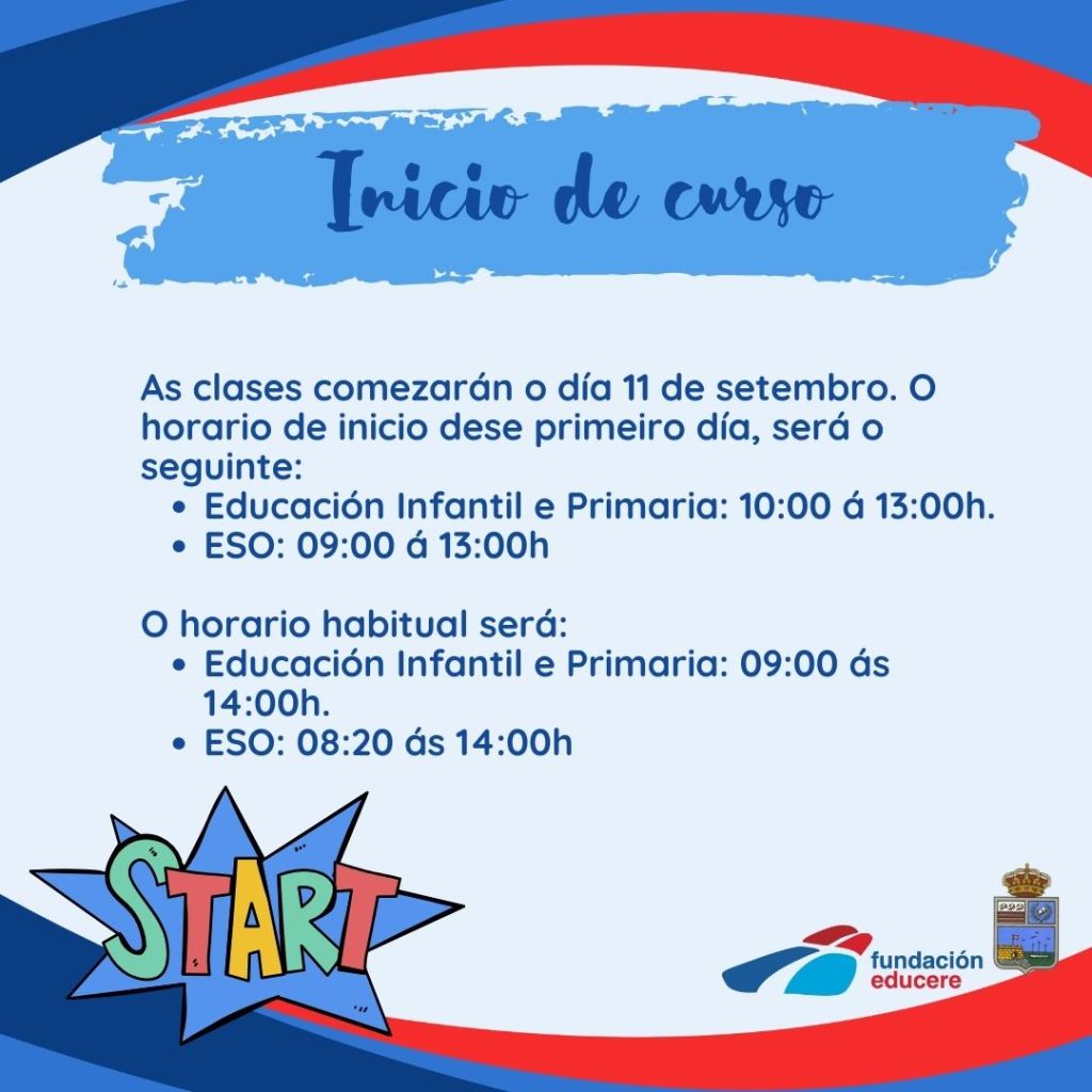 As clases comezarán o día 11 de setembro. O horario de inicio dese primeiro día, será o seguinte: