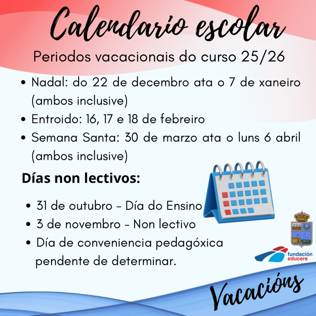 Así mesmo, lembramos os períodos vacacionais e días non lectivos establecidos para este curso: